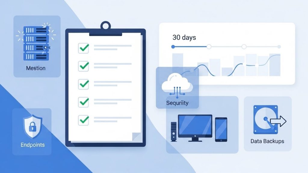 An IT assessment is easiest when you run it like a 30-day sprint. You gather facts, find risks, and turn gaps into a ranked plan. This checklist breaks the work into clear day ranges. It helps you avoid “random auditing” and missed systems. Most teams start faster once everyone agrees what an IT assessment includes, and what outcomes it should produce. Then you follow the steps below and document everything as you go.